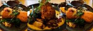 Served with cauliflower puree, roast potatoes, maple glazed parsnips, rainbow carrots,