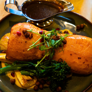 tender stem broccoli, roasted chick peas and rosemary & red wine gravy…£18.50 (Ve)